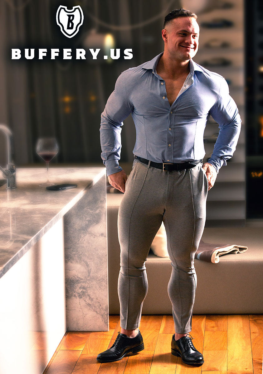 The Buffery® Flex Slacks can fit the legs and glutes of the biggest bodybuilder in a Euro-style cut and sit securely at the waist - WITHOUT a belt! The American four-way stretch Velare-CoreTech™ fabric is extremely resistant to pilling, as well as stains and wrinkles. These pants in our signature Second Skin silhouette are form-flattering and free-moving built to highlight your assets without squishing them flat. With a taper at the knee these slacks are designed to show some ankle. Machine washable. You'll want one in every color! (Also available with a red, white, and blue stripe along the quad sweep: USA Flex Slacks.)